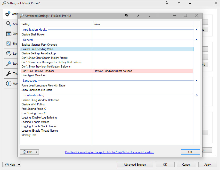 In FileSeek 4.3, you can disable them on the Settings > Preview Handlers tab.
