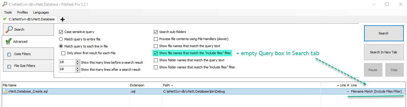 I want to find files in a large folder containing thousands which have file names defined as RegEx. For instance, to find all SQL files that have '_Create' in the name I define Include Files as '.*_Create\.sql' and set Include Files Filter is RegEx option. I leave Query empty.