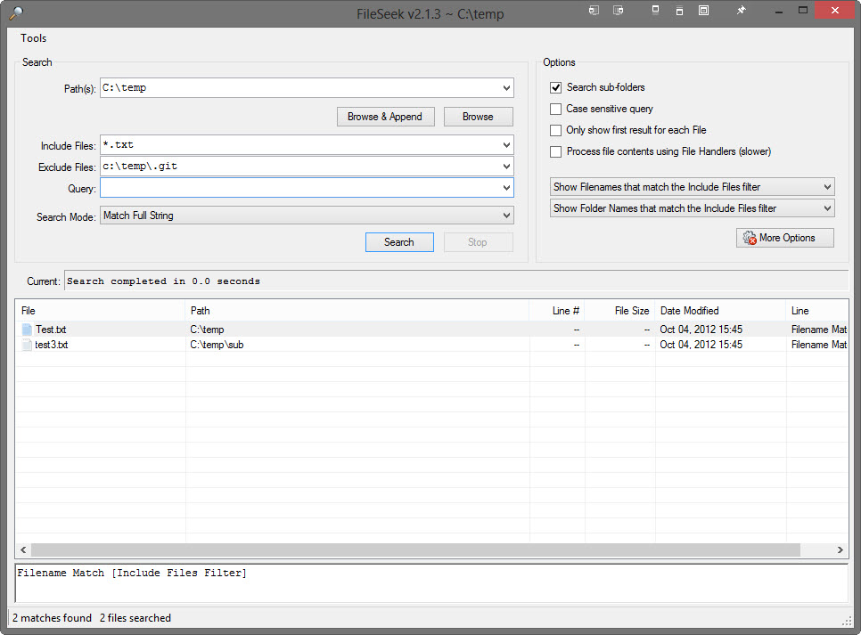 You can enter the full path of the folder to exclude in the "Exclude Files" text box. If you want to exclude multiple folders, you can separate them using the | symbol. For example: c:\temp\.git|c:\temp\sub