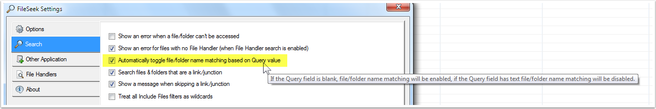 9. In the Options section, when I select "Show file names (AND folder names) that match the query text", as soon as I click the Search button, these both revert to "Don't show...". Do these two options only work at some specific folder level?