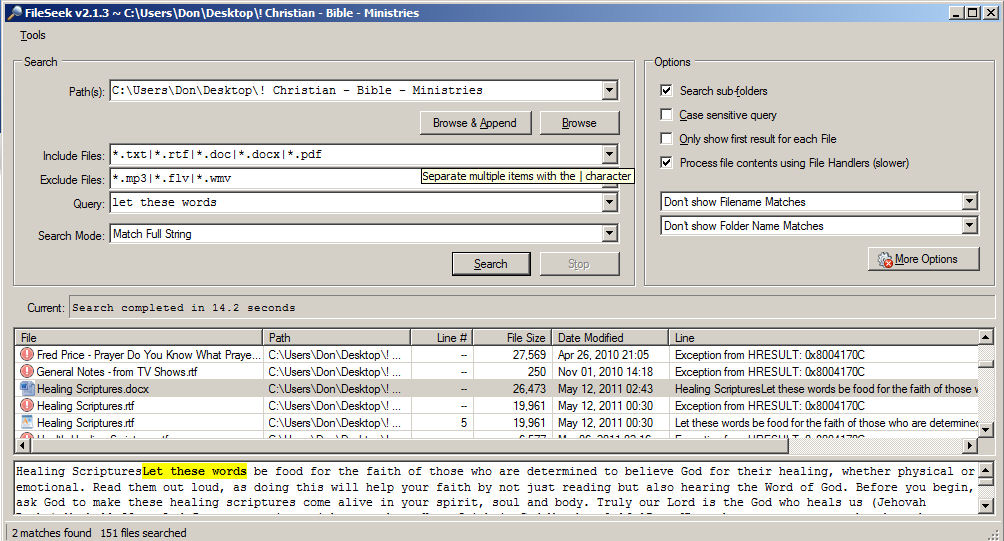 Thank you for creating this great freeware program!! Windows 7 Search is terrible as it can't even locate text phrases inside of files, no matter what options I use. Since I've already spent too much time online looking for answers, your program is definitely needed and much appreciated!