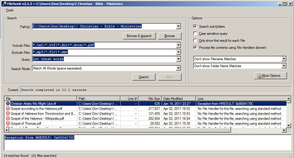 2. In the Line column for most of the listed .RTF files is the following: "Exception from HRESULT: 0x8004170C" But there are a couple of RTF files listed where File Seek found the search text, with the Line column text: "Multiple word match [AND]". What is the exception and how do I fix the problem?