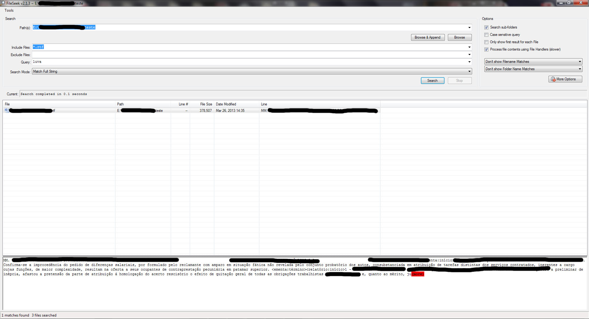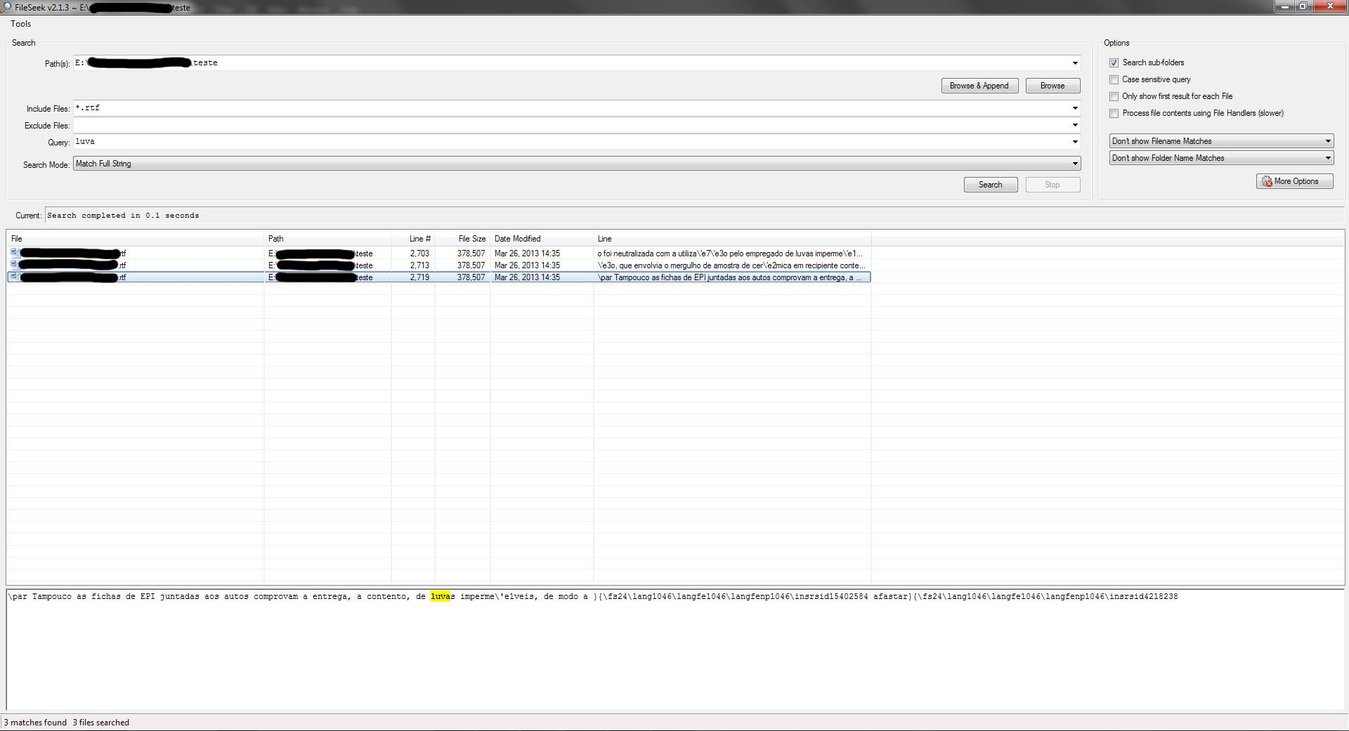 I'm having a problem while searching inside RTF files. Whenever "Process file contents using File Handlers" is checked, the word I'm searching for is found, but the preview box below doesn't show the part of the text in which it was found - just the first few lines of the file and then (more) highlighted in red (see test1.jpg). If I uncheck "Process file contents..." then the right part of the text is previewed and highlighted in yellow, but the text is all garbled up and I can't search accented words (because they're garbled - see test2.jpg - the word right next to "luvas" is supposed to be "impermeáveis"). This is an issue mostly when searching non-English text, but even the English language uses a few accented words derived from other languages, so I guess the answer to this might be useful for anyone.
