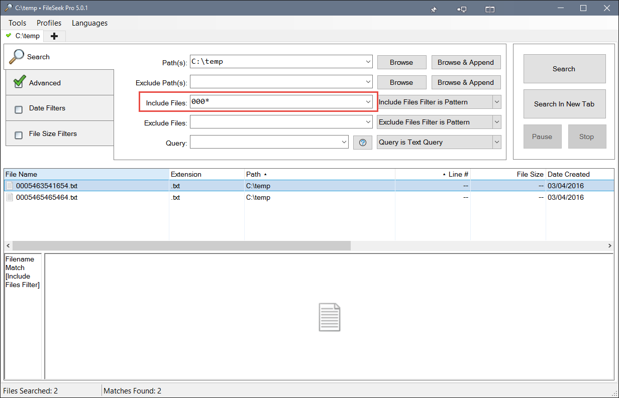 When I choose "Include Files Filter is Pattern" No result appear at all