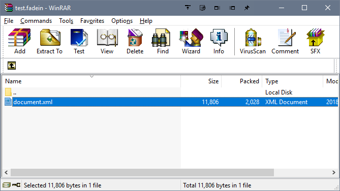 I already spoke to the developer of Fade In, who told me that *.fadein files are essentially zip containers with text inside.